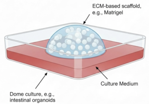 To create a dome culture, a small droplet of cells suspended in Matrigel or Geltrex is deposited onto a culture surface and allowed to solidify into a hemispherical structure before culture medium is carefully added without disturbing the dome. This format creates a localized 3D microenvironment that can support complex tissue organization, particularly for intestinal, neural, and tumor-derived organoids. However, dome-based workflows are highly sensitive to ECM concentration, temperature, and lot-to-lot variability, making them challenging to standardize across experiments and laboratories. Even small differences in dome volume or gelation can result in substantial variation in organoid size and morphology.